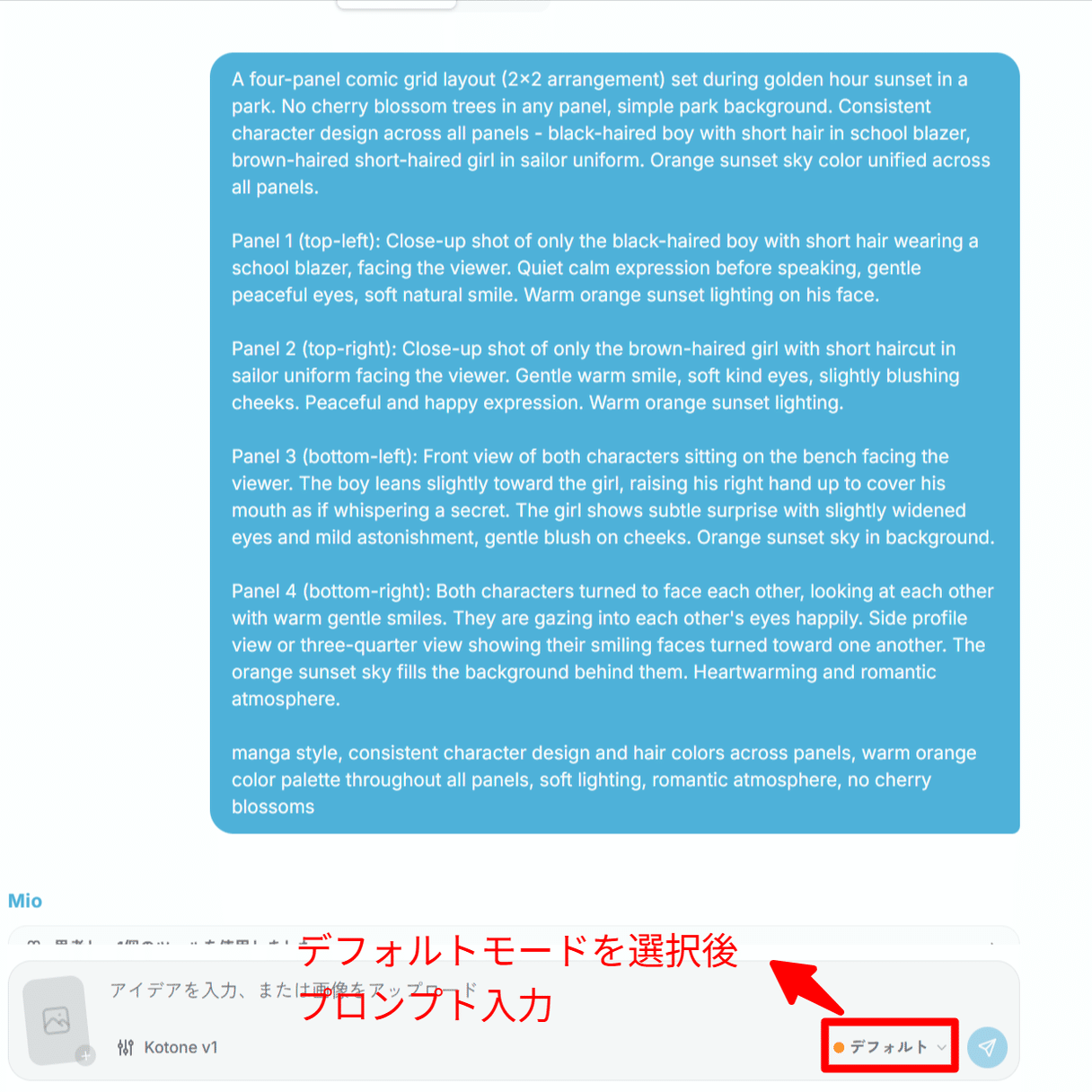 理想の構成が出来上がったら、Mio.2にプロンプトを考えてもらい、「デフォルトモード」からプロンプトを入力します。