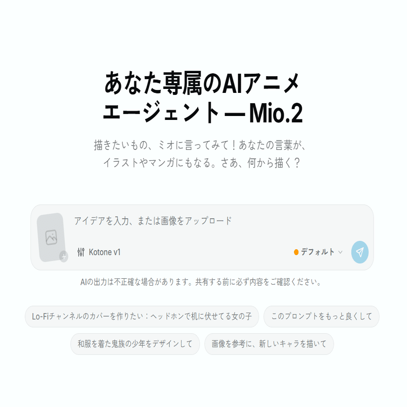 Mio.2は、キャラクターやシーンのイメージを日本語で伝えるだけで、プロンプト設計や構図の提案まで、制作全般をサポートしてくれるのが特徴です。