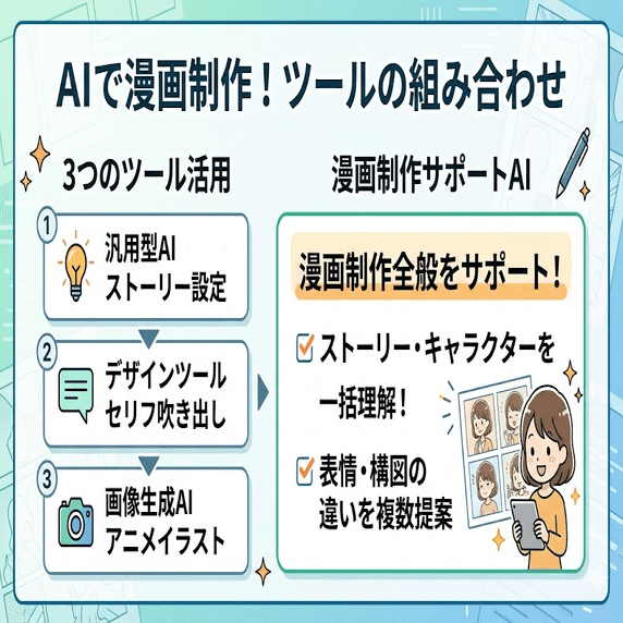 ストーリー生成やキャラクター設定を考えるときは「汎用型AI」、セリフや吹き出しを追加する際は「デザインツール」を使うのが便利です。
