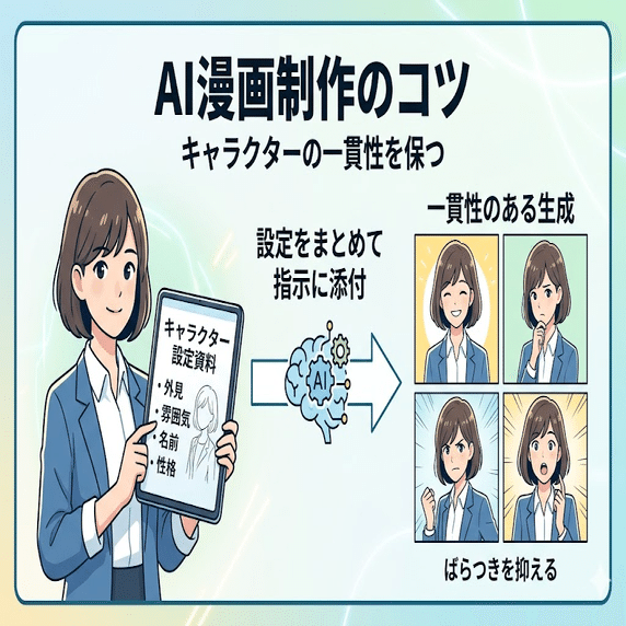 AI漫画制作では、キャラクターの一貫性を保ちながら生成するのがコツです。